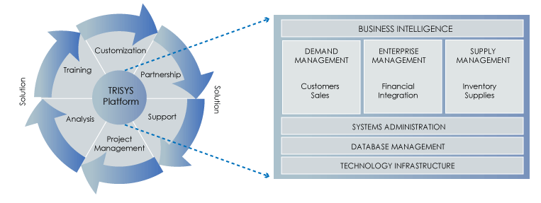Our integrated solution,TRISYSV1.21 (system demo available on request), incorporates the complete suite of business functions and processes, including industry-leading enhancements across the extended supply chain. (Click Examples to view a cross-section of TRISYS product functionality) TRISYS is structured across four solution domains; Demand, Enterprise, Supply and Intelligence.